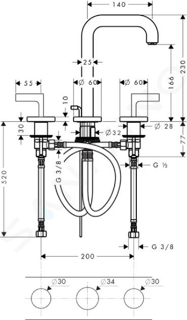 Baterie stativă lavoar, 3 orificii cu evacuare