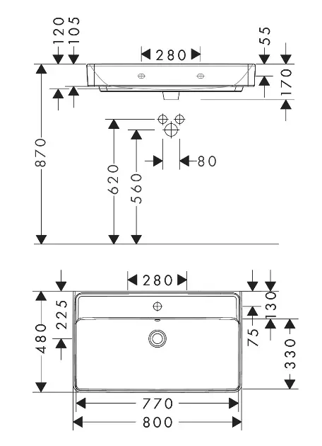 Lavoar cu placă de spălare 800/480 cu orificiu pentru robinet, cu revărsare